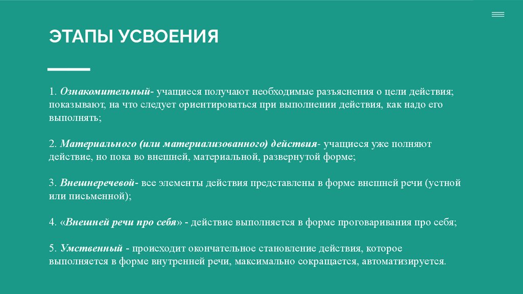 ЭТАПЫ УСВОЕНИЯ1. Ознакомительный- учащиеся получают необходимые разъяснения о цели действия;