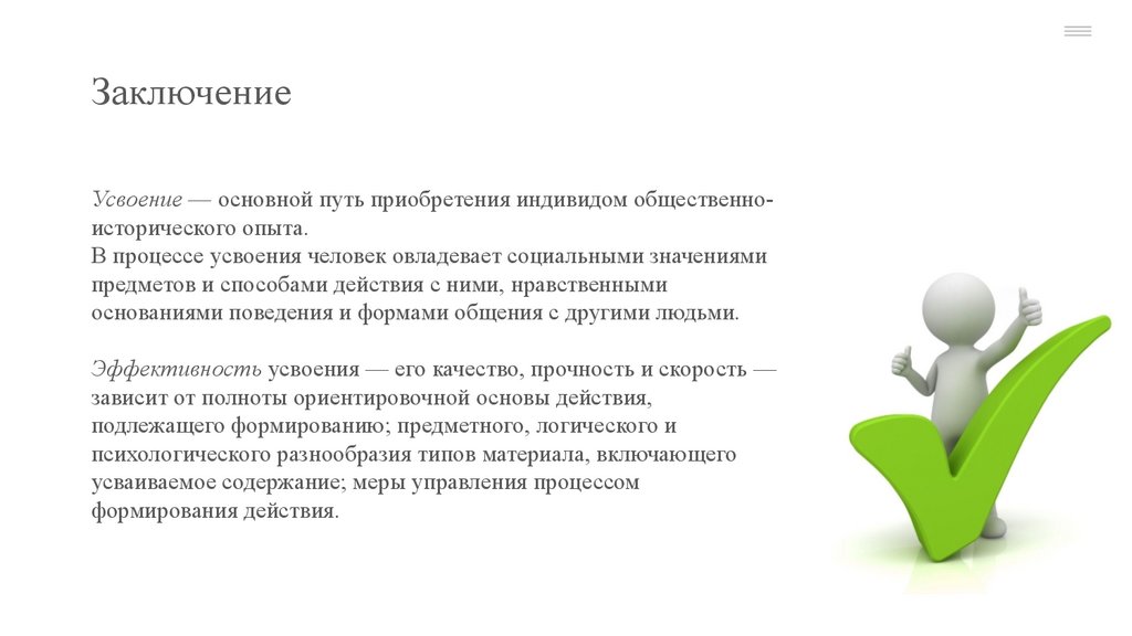 ЗаключениеУсвоение — основной путь приобретения индивидом общественноисторического опыта.