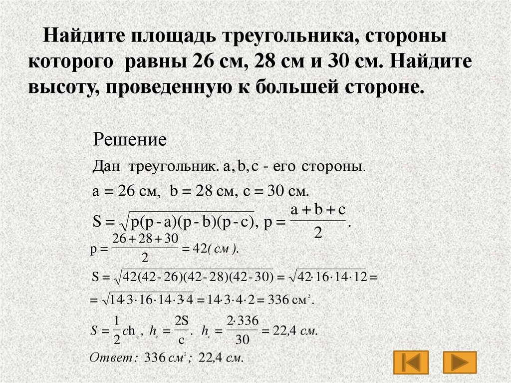 Найдите площадь треугольника, стороныкоторого равны 26 см, 28 см и 30 см. Найдите