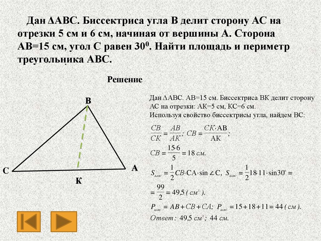 Дан ΔАВС. Биссектриса угла В делит сторону АС наотрезки 5 см и 6 см, начиная от вершины А. Сторона