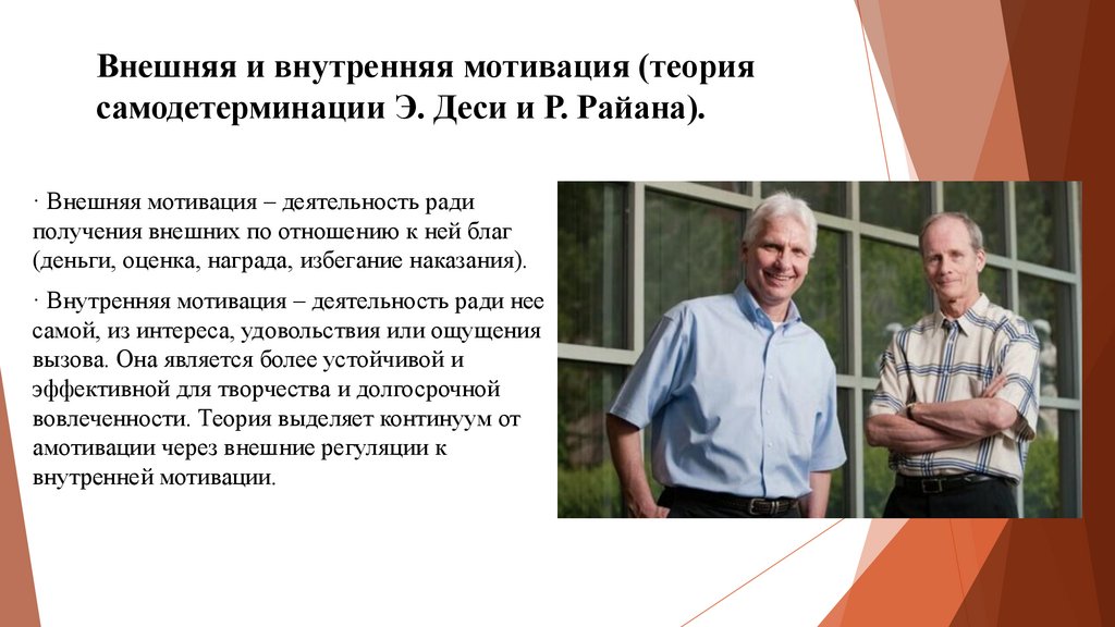 Внешняя и внутренняя мотивация (теориясамодетерминации Э. Деси и Р. Райана).