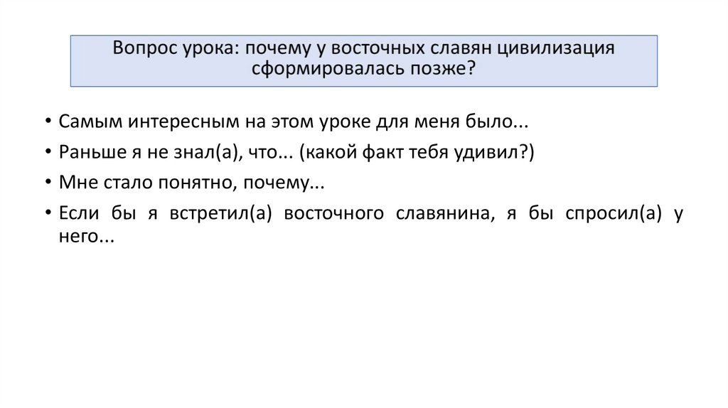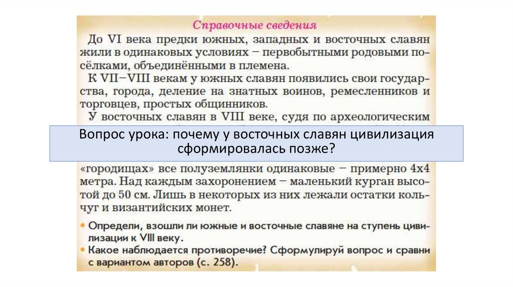 Вопрос урока: почему у восточных славян цивилизациясформировалась позже?