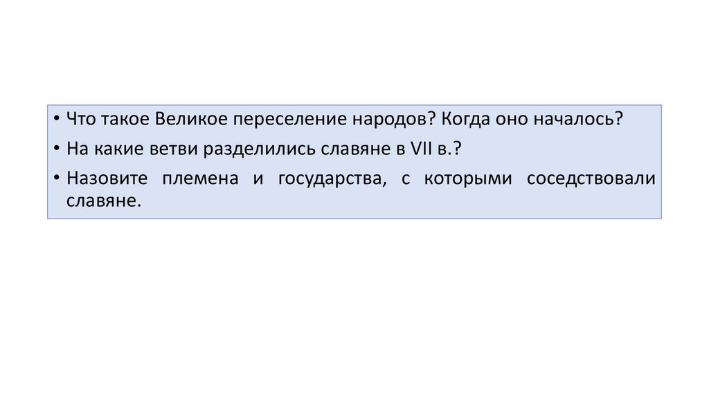 • Что такое Великое переселение народов? Когда оно началось?• На какие ветви разделились славяне в VII в.?
