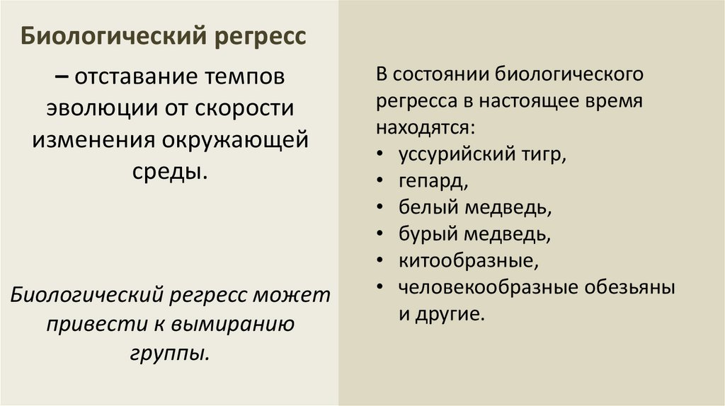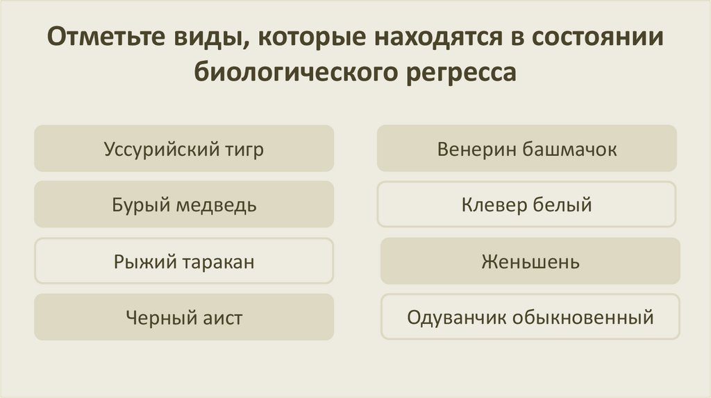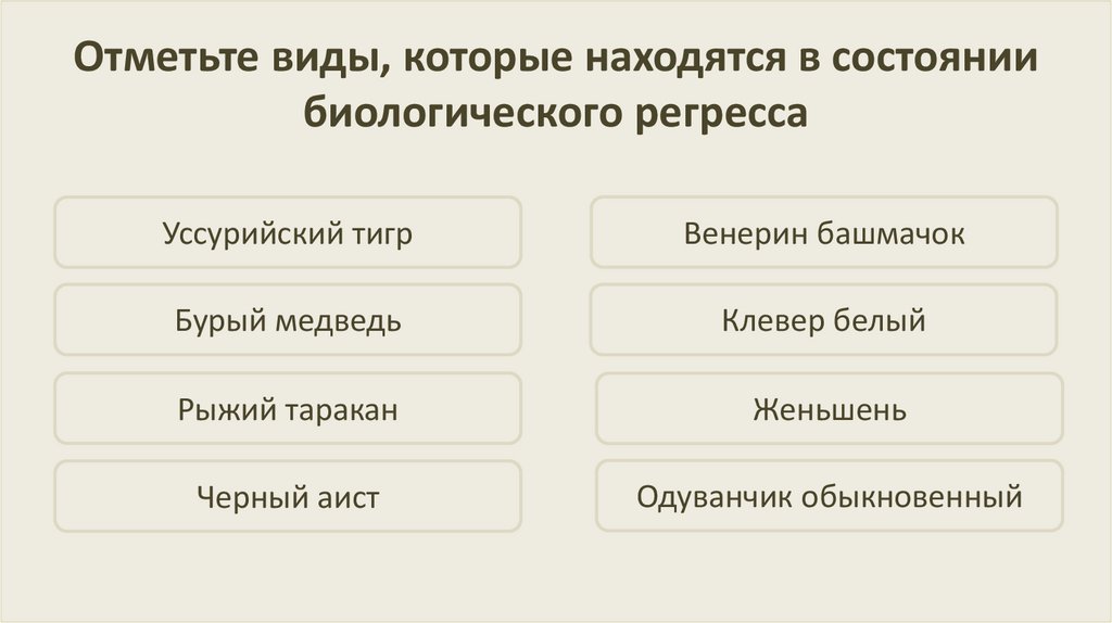 Отметьте виды, которые находятся в состояниибиологического регресса