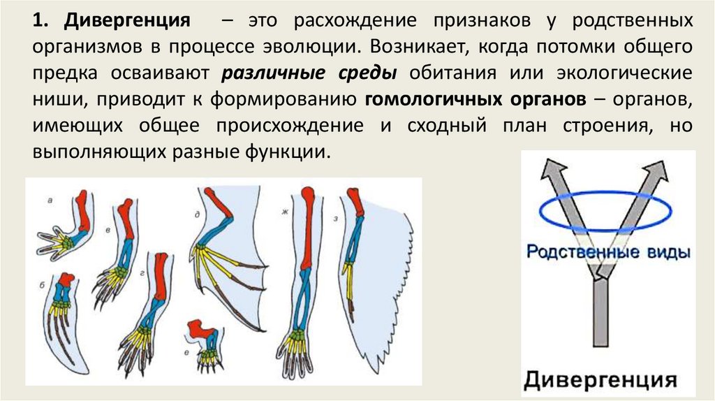 1. Дивергенция – это расхождение признаков у родственныхорганизмов в процессе эволюции. Возникает, когда потомки общего