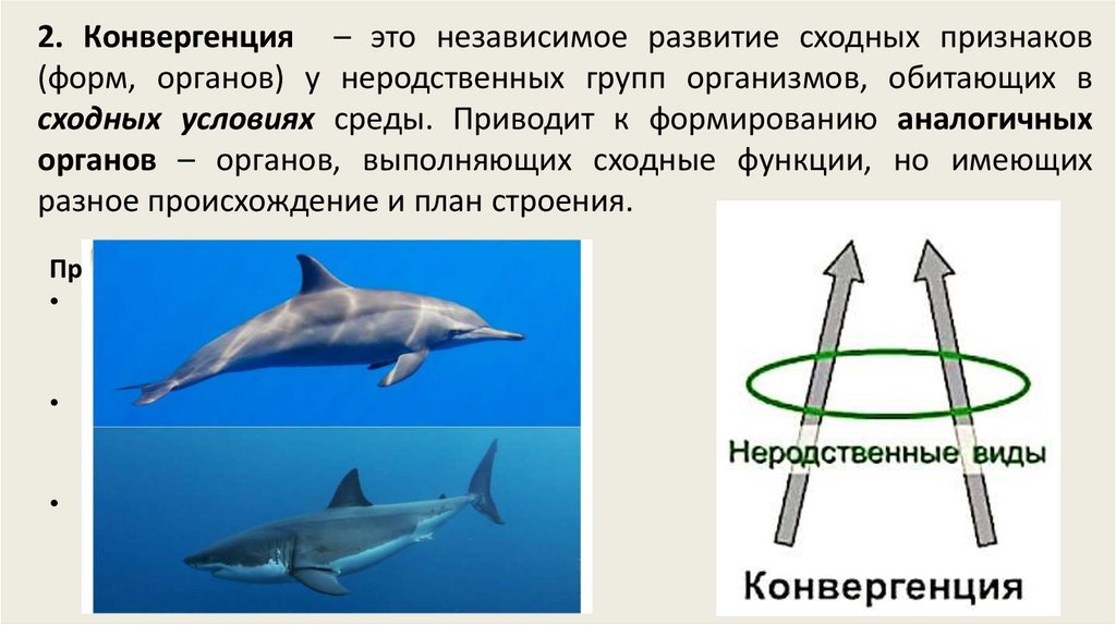 2. Конвергенция – это независимое развитие сходных признаков(форм, органов) у неродственных групп организмов, обитающих в