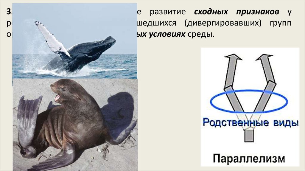 3. Параллелизм: Независимое развитие сходных признаков уродственных, но ранее разошедшихся (дивергировавших) групп