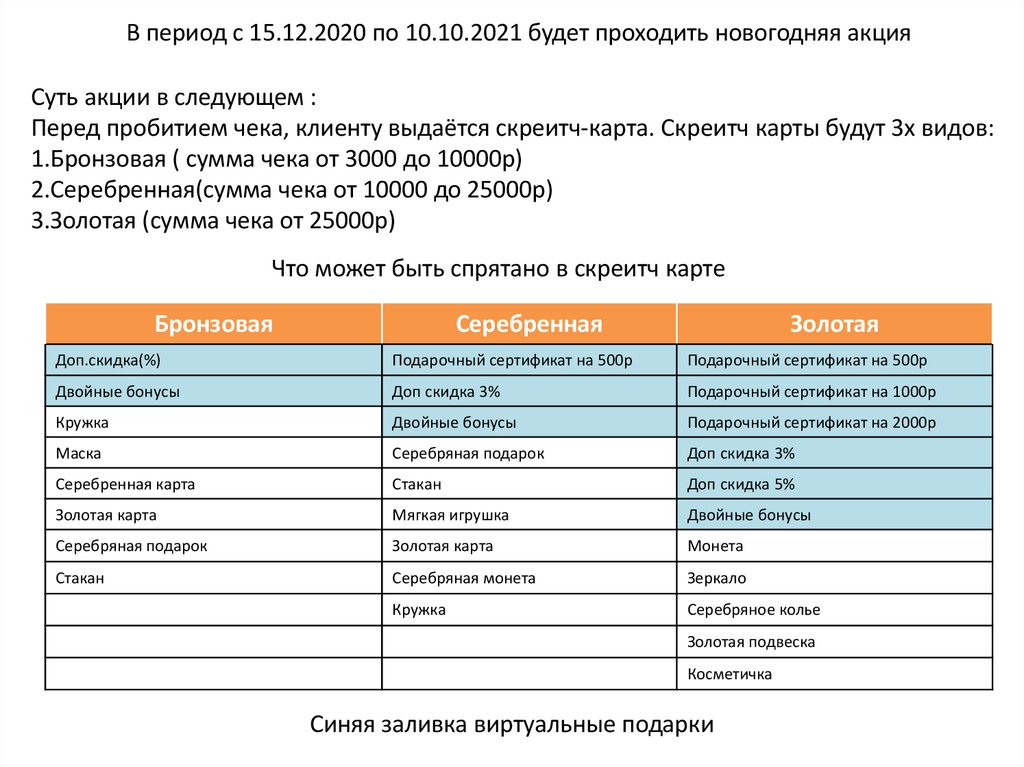 Перед пробитием чека, клиенту выдаётся скреитч-карта. Скреитч карты будут 3х видов: