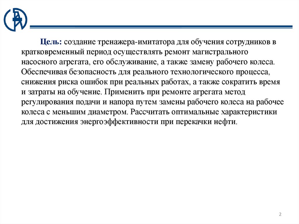 Цель: создание тренажера-имитатора для обучения сотрудников вкратковременный период осуществлять ремонт магистрального