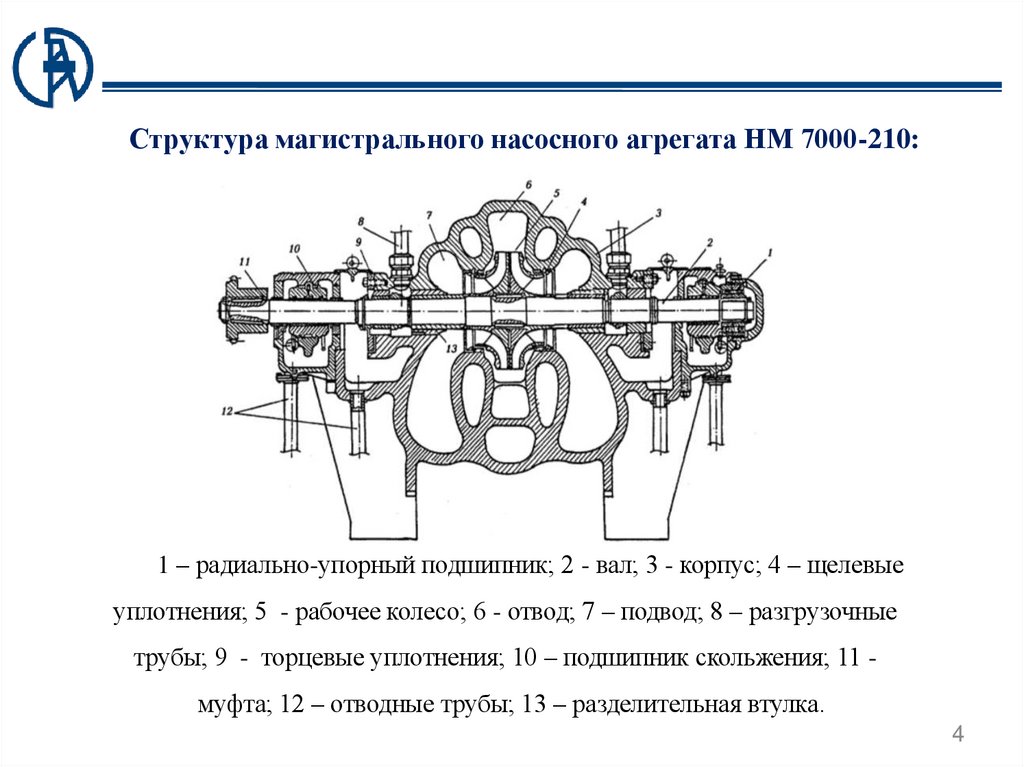 Структура магистрального насосного агрегата НМ 7000-210:1 – радиально-упорный подшипник; 2 - вал; 3 - корпус; 4 – щелевые