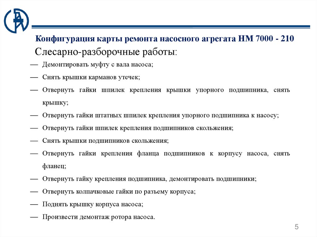 Конфигурация карты ремонта насосного агрегата НМ 7000 - 210Слесарно-разборочные работы: