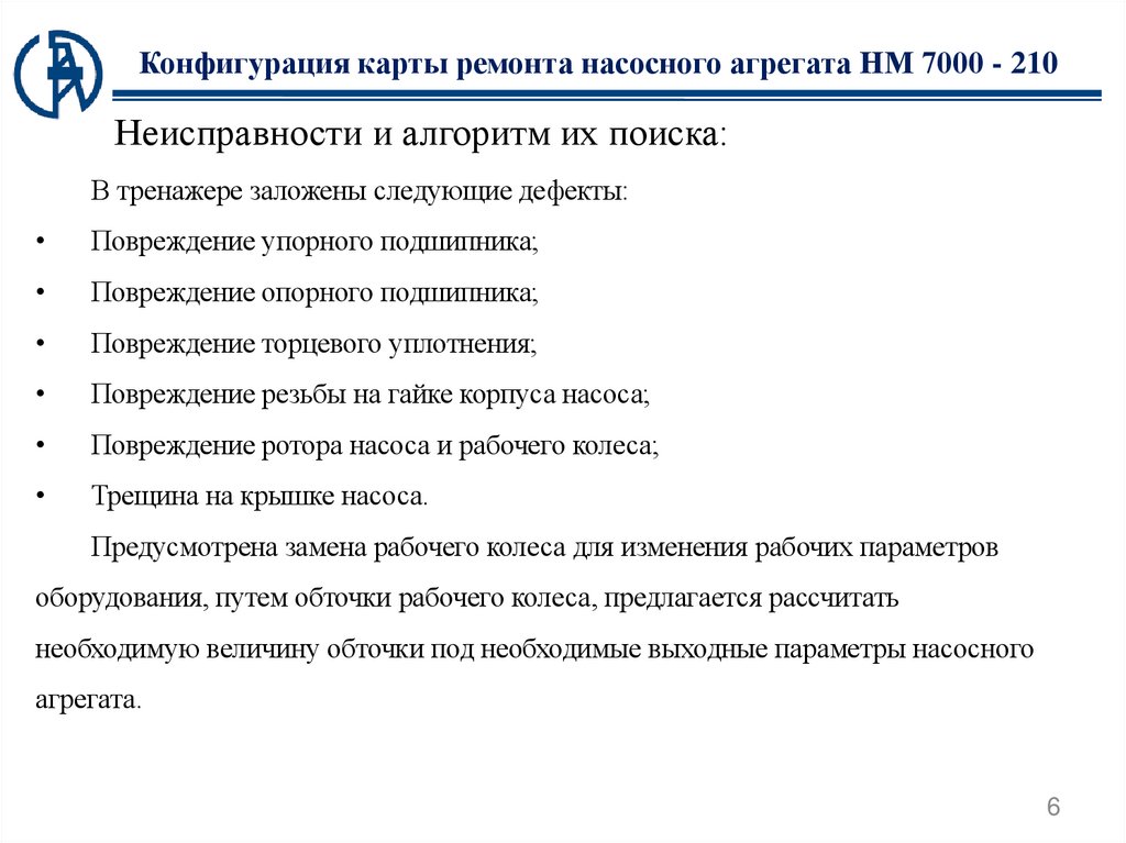Конфигурация карты ремонта насосного агрегата НМ 7000 - 210Неисправности и алгоритм их поиска: