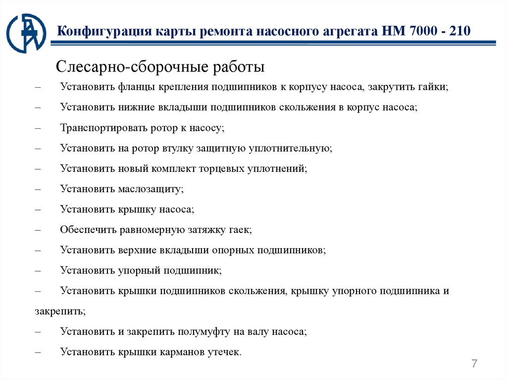 Конфигурация карты ремонта насосного агрегата НМ 7000 - 210Слесарно-сборочные работы