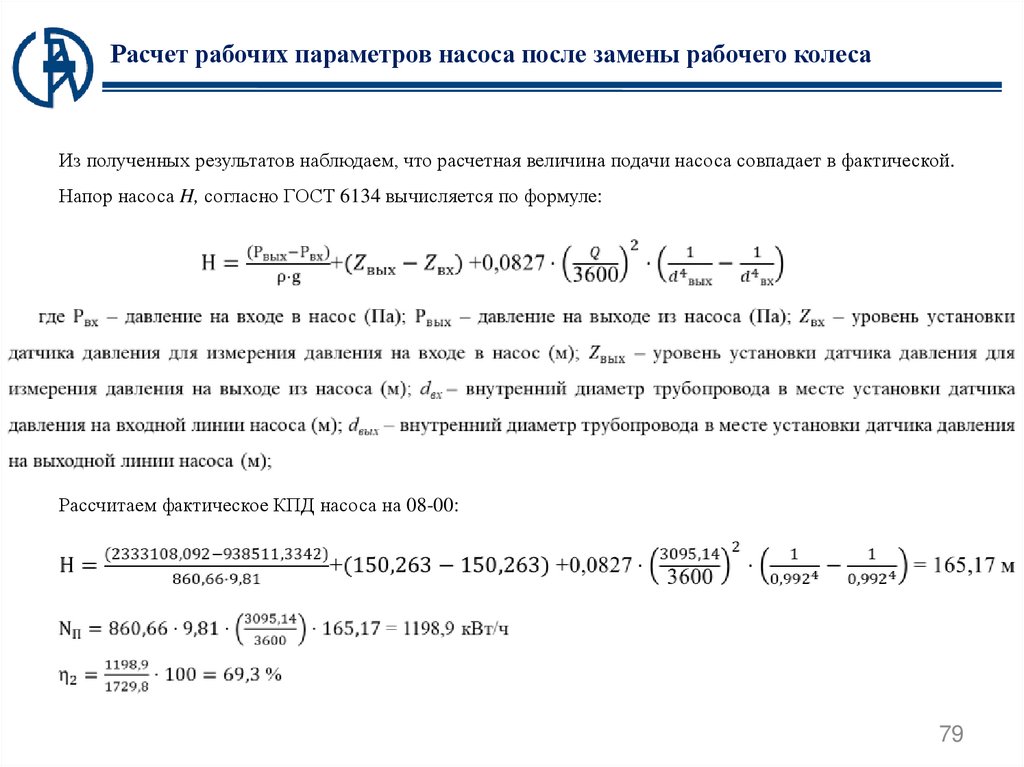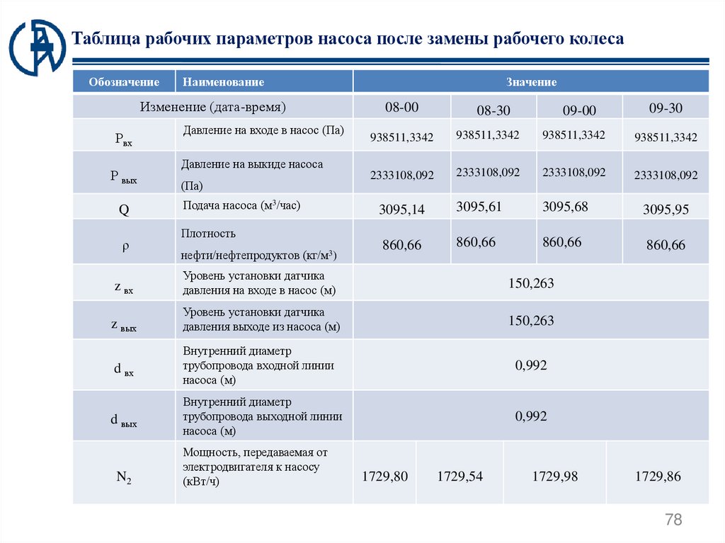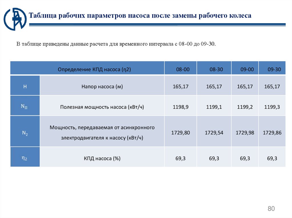 Таблица рабочих параметров насоса после замены рабочего колесаВ таблице приведены данные расчета для временного интервала с 08-00 до 09-30.