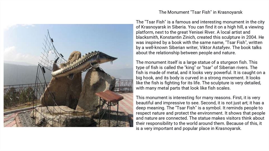 The Monument "Tsar Fish" in KrasnoyarskThe "Tsar Fish" is a famous and interesting monument in the city