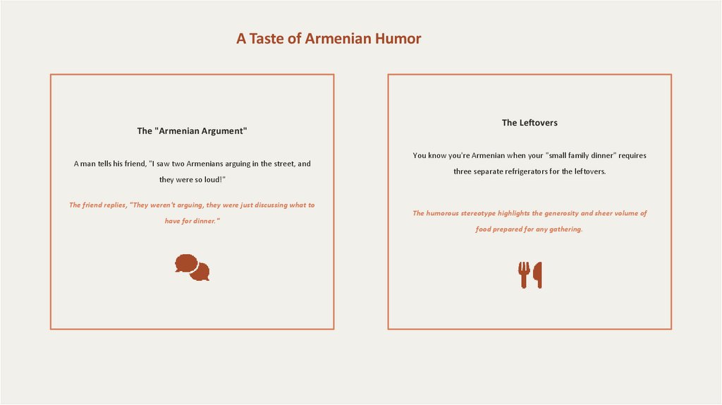 A humorous stereotype is that Armenian leftovers could "feed a village." This