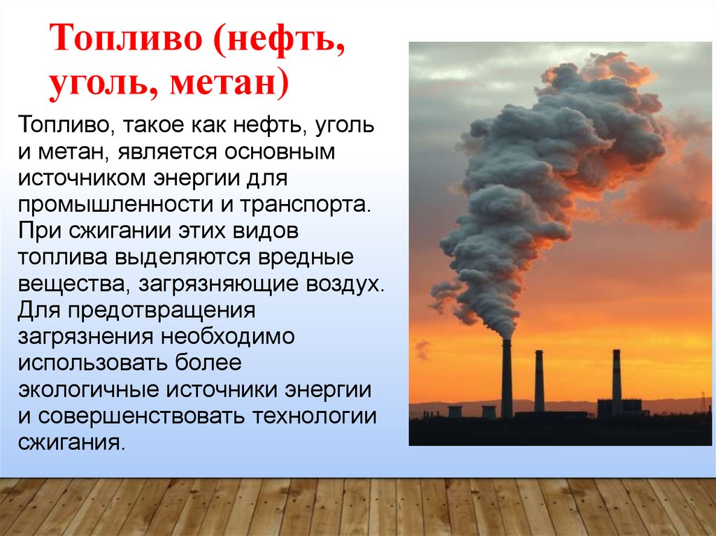 Топливо (нефть, уголь и метан).Загрязнение воздуха, способы его