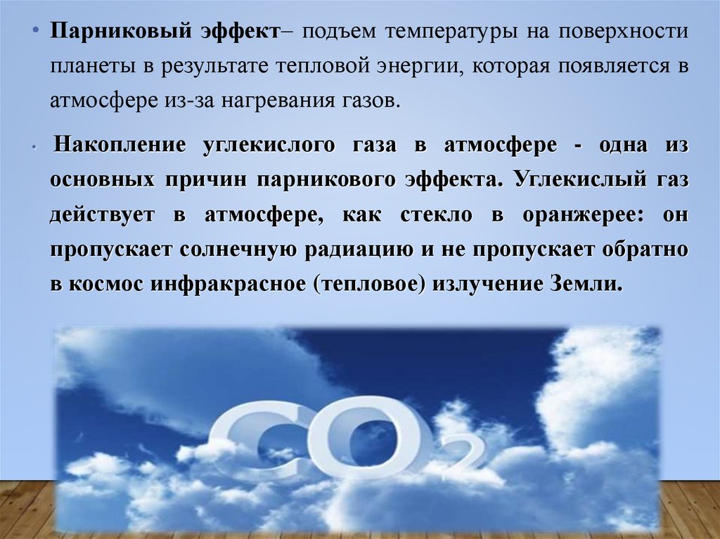 • Парниковый эффект– подъем температуры на поверхностипланеты в результате тепловой энергии, которая появляется в