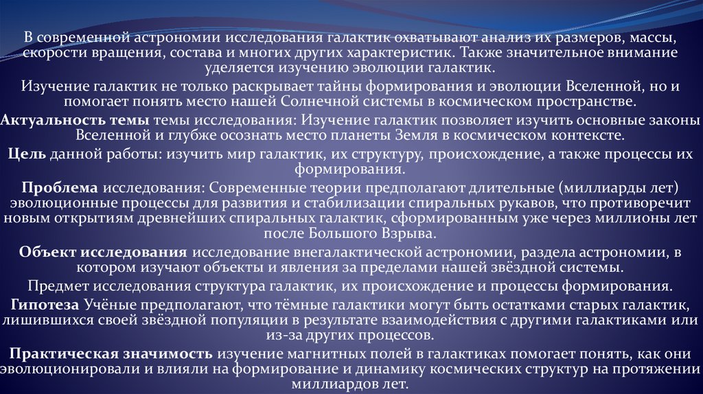 Актуальность темы темы исследования: Изучение галактик позволяет изучить основные законы