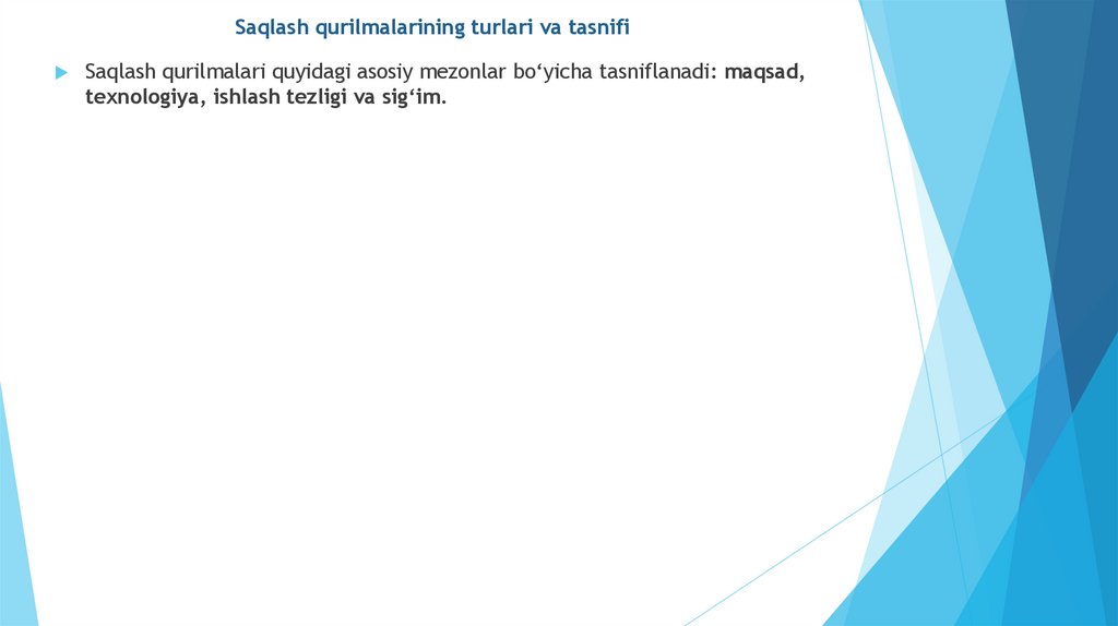 Saqlash qurilmalarining turlari va tasnifiSaqlash qurilmalari quyidagi asosiy mezonlar bo‘yicha tasniflanadi: maqsad,