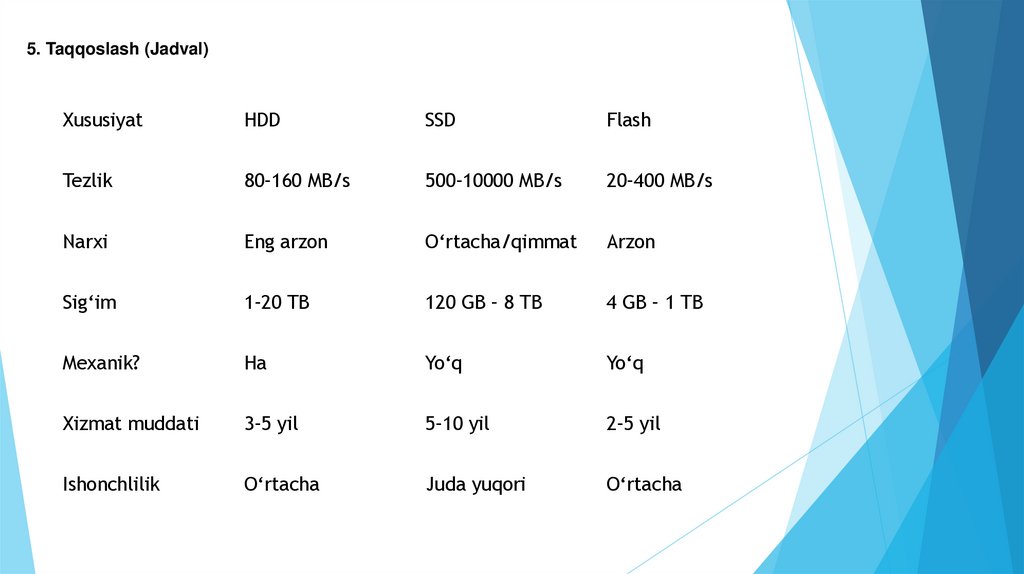 5. Taqqoslash (Jadval)Xususiyat