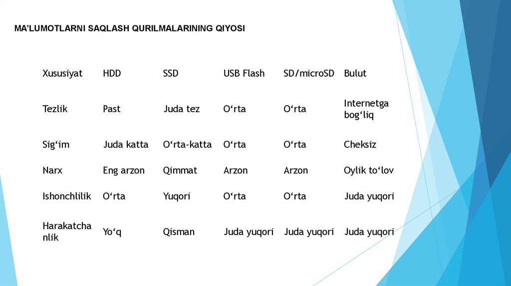 MA’LUMOTLARNI SAQLASH QURILMALARINING QIYOSIXususiyat
