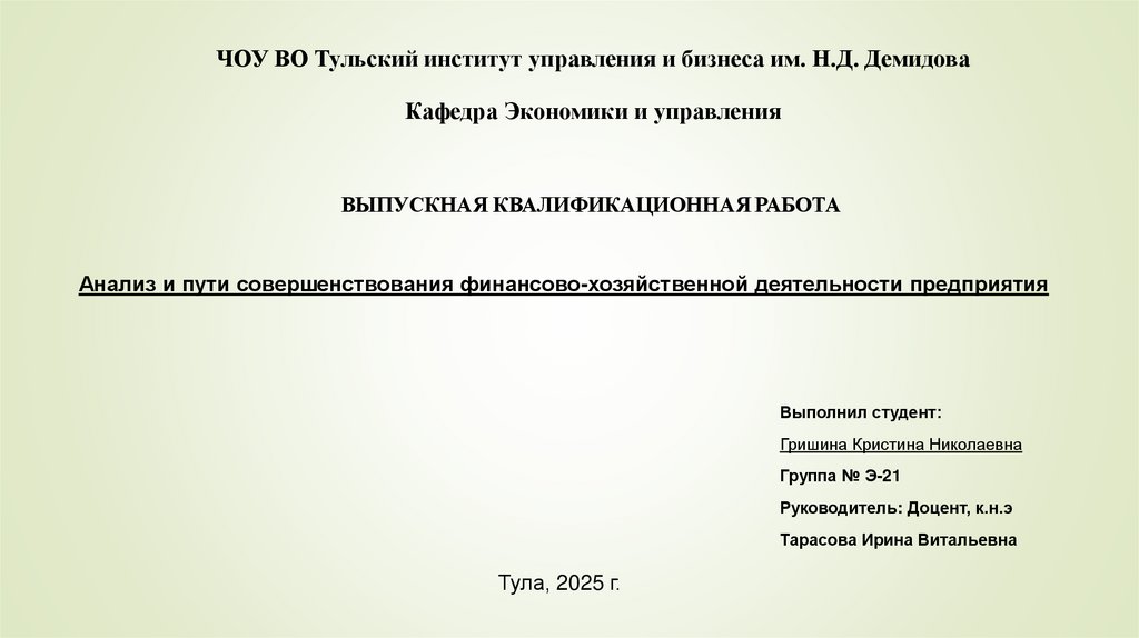 ЧОУ ВО Тульский институт управления и бизнеса им. Н.Д. ДемидоваКафедра Экономики и управления