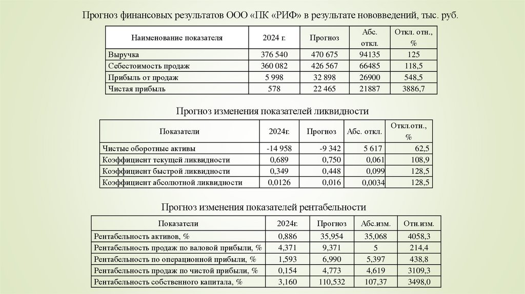 Прогноз финансовых результатов ООО «ПК «РИФ» в результате нововведений, тыс. руб.Наименование показателя
