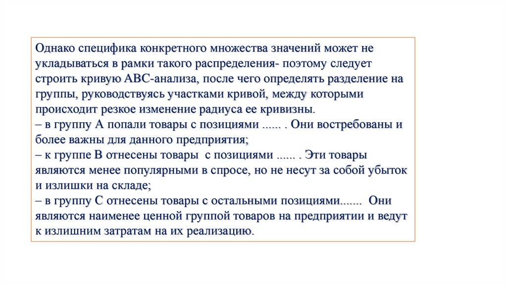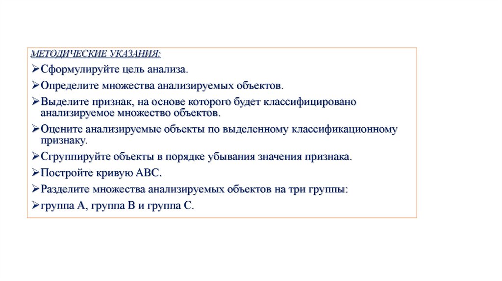 Идея анализа АВС состоит в том, чтобы из всего множества однотипныхобъектов выделить группы, наиболее значимые с точки зрения обозначенной