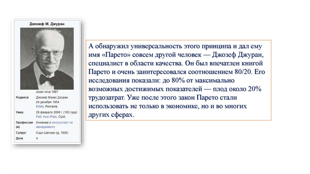 А обнаружил универсальность этого принципа и дал емуимя «Парето» совсем другой человек — Джозеф Джуран,