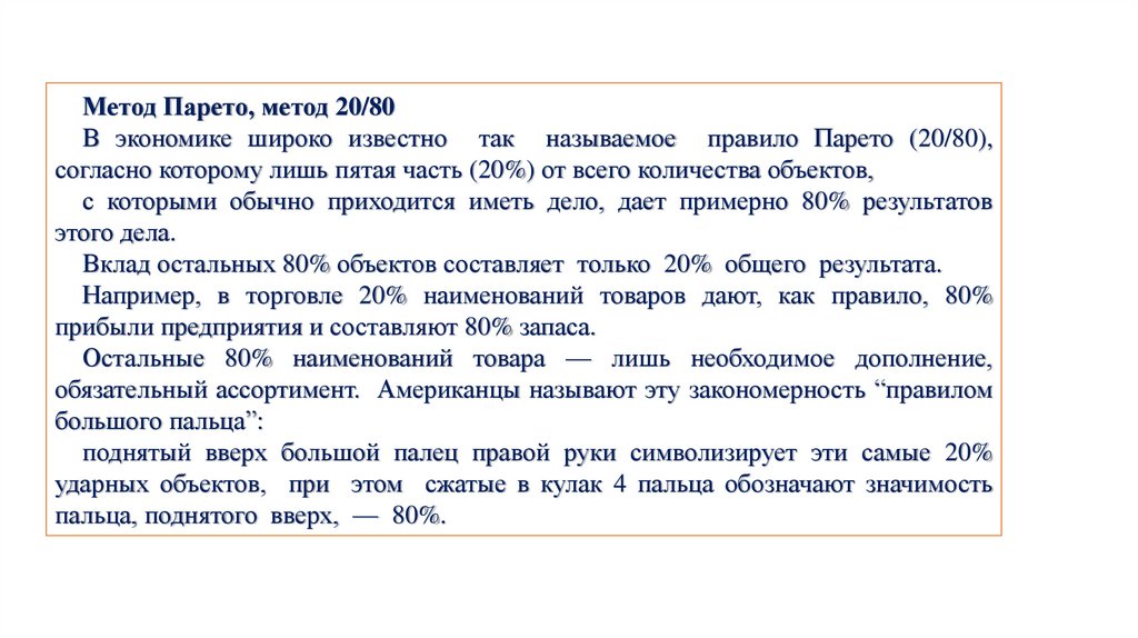 Метод Парето, метод 20/80В экономике широко известно так называемое правило Парето (20/80),