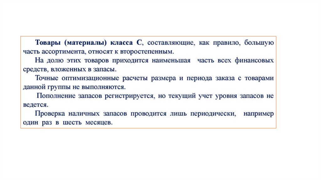 Товары (материалы) класса С, составляющие, как правило, большуючасть ассортимента, относят к второстепенным.