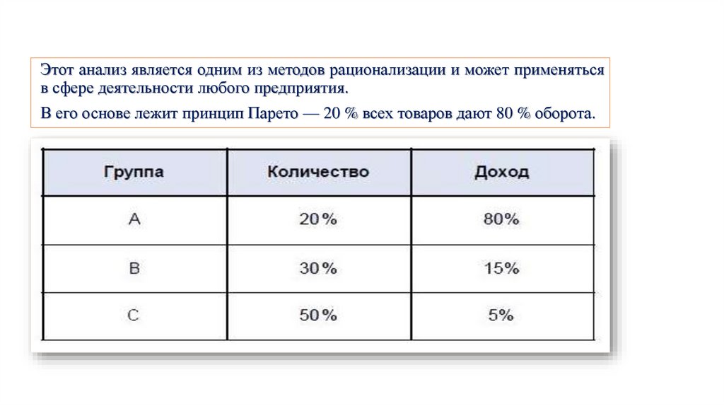 В его основе лежит принцип Парето — 20 % всех товаров дают 80 % оборота.