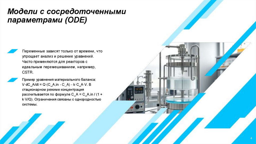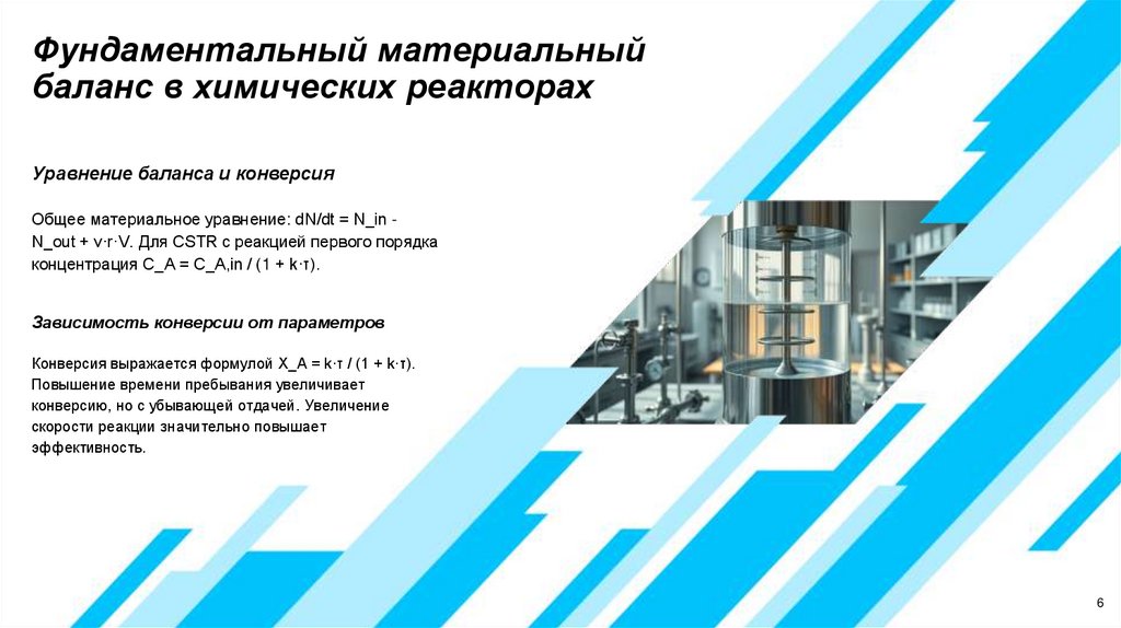 Общее материальное уравнение: dN/dt = N_in N_out + ν·r·V. Для CSTR с реакцией первого порядка