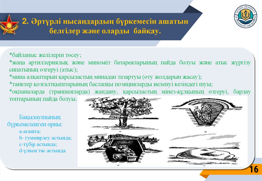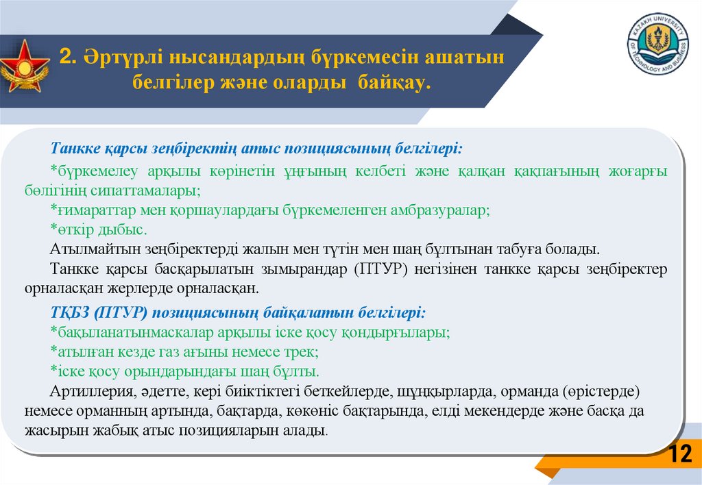 алынады, жақсы көріністі қамтамасыз етуі, бүркемеленуді, қарсыластың атысынан