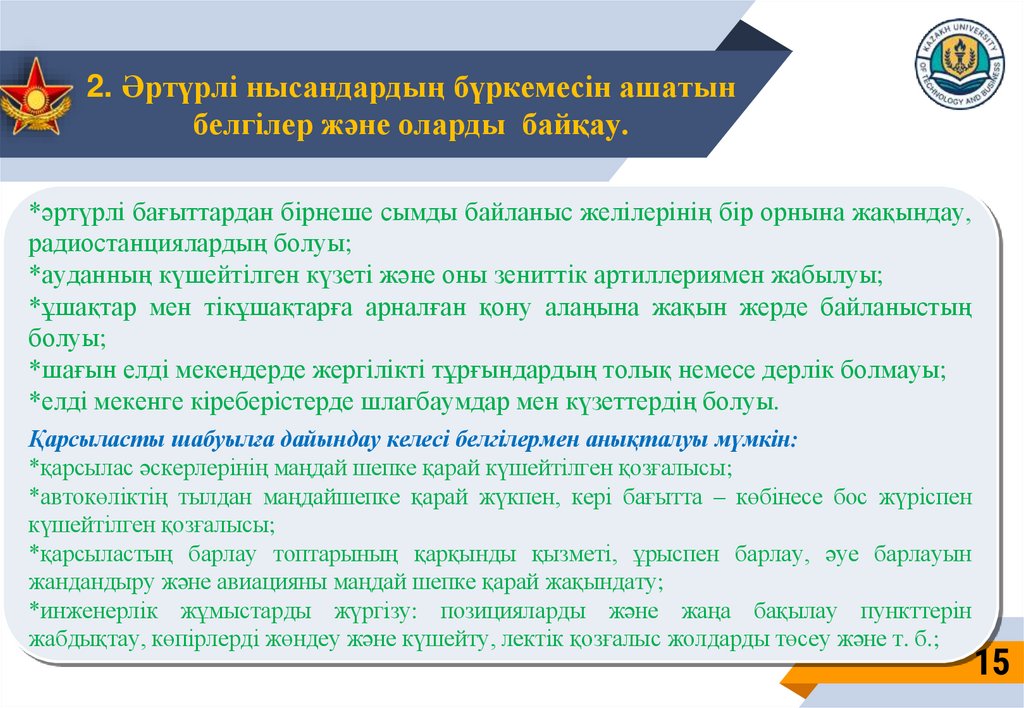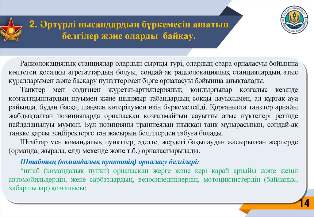 1. Қарсылас пен жергілікті жерді, көршілердің ісқимылдарын және командирдің орнындағы жәнеқозғалыстағы белгілерін бақылау тәсілдері.