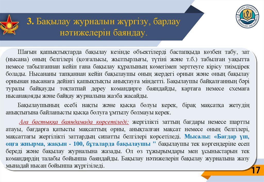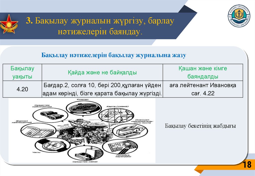 командирдің талабы бойынша баяндайды. Бақылау нәтижелерін бақылау журналына жазу