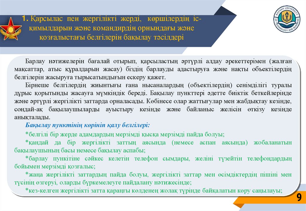 1.Қарсылас пен жергілікті жерді, көршілердің ісқимылдарын және командирдің орнындағы және қозғалыстағыбелгілерін бақылау тәсілдері.