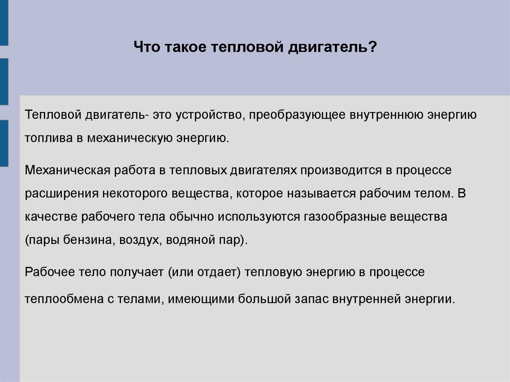 Что такое тепловой двигатель?Тепловой двигатель- это устройство, преобразующее внутреннюю энергию