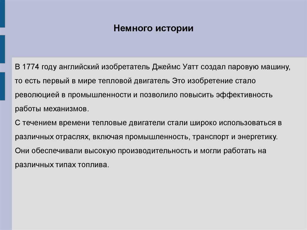 Немного историиВ 1774 году английский изобретатель Джеймс Уатт создал паровую машину,