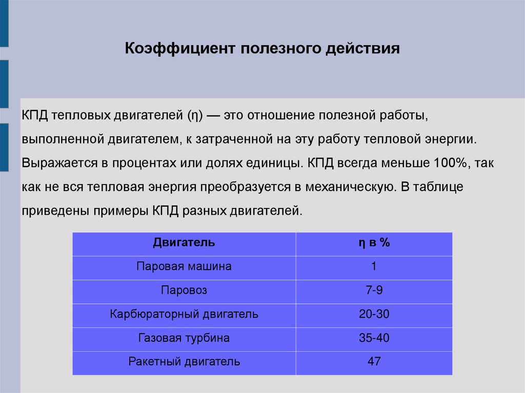 Коэффициент полезного действияКПД тепловых двигателей (η) — это отношение полезной работы,