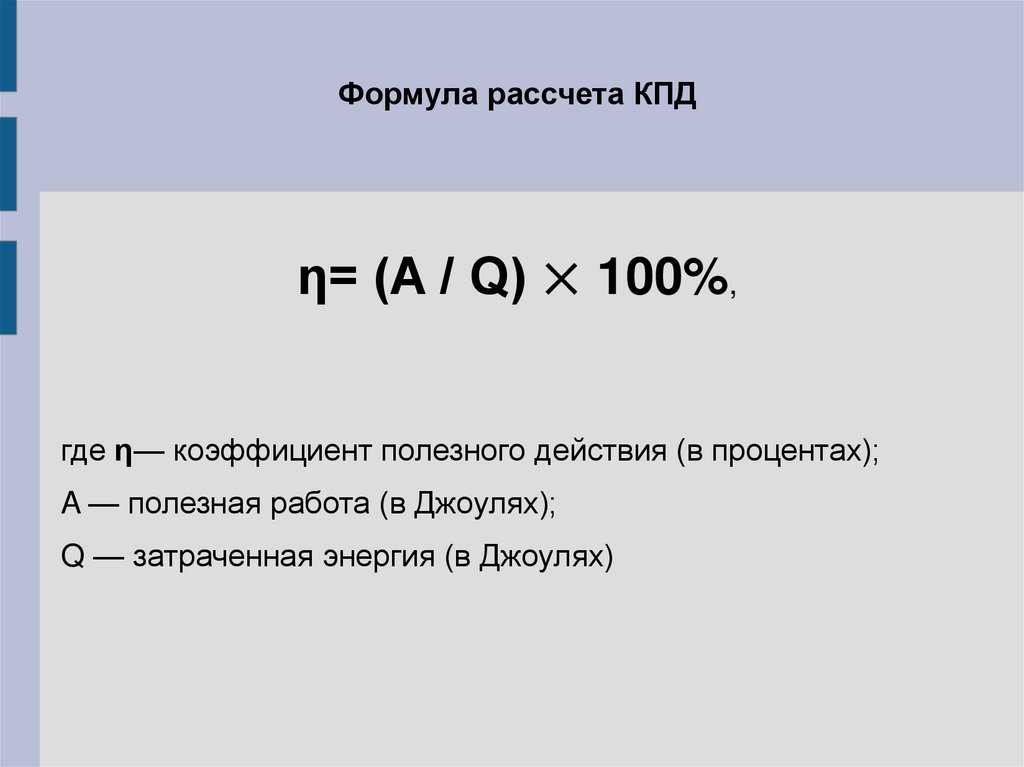 Формула рассчета КПДη= (A / Q) × 100%,