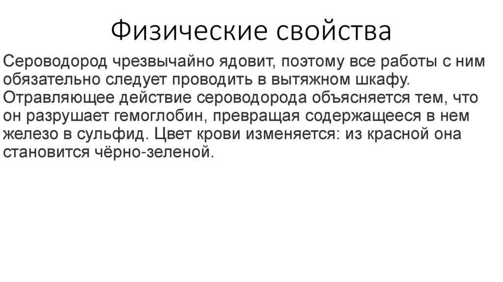 Физические свойстваСероводород чрезвычайно ядовит, поэтому все работы с ним