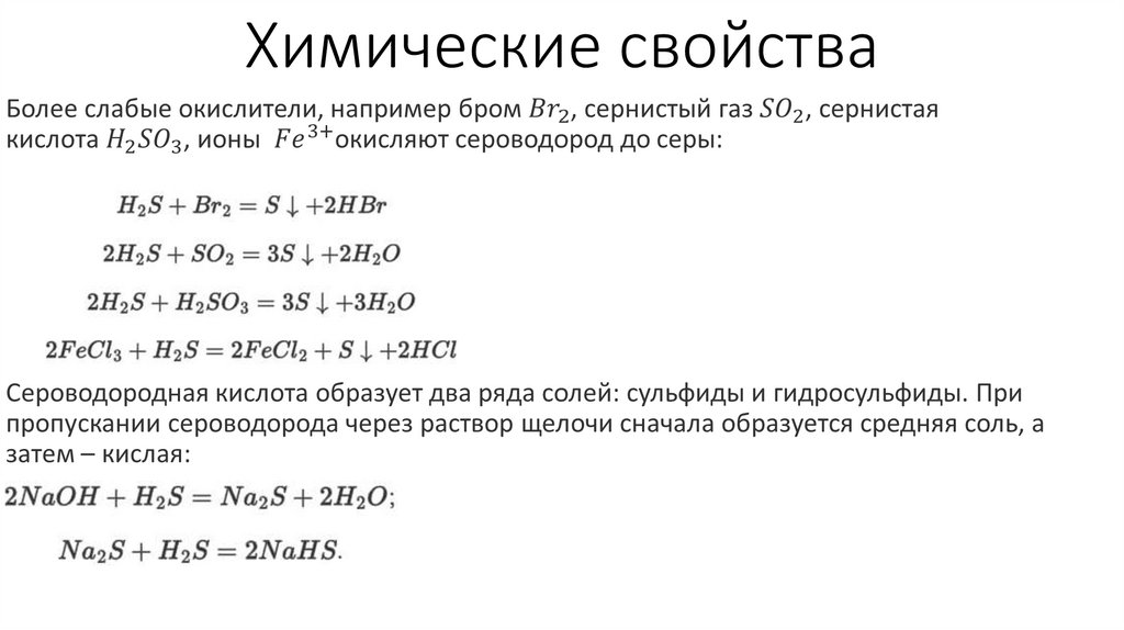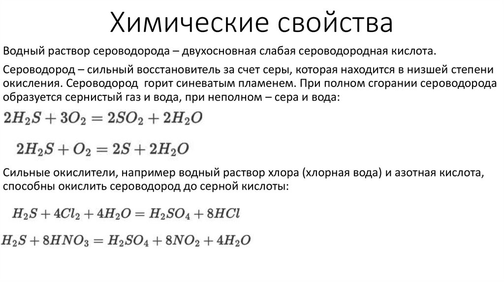 Химические свойстваВодный раствор сероводорода – двухосновная слабая сероводородная кислота.