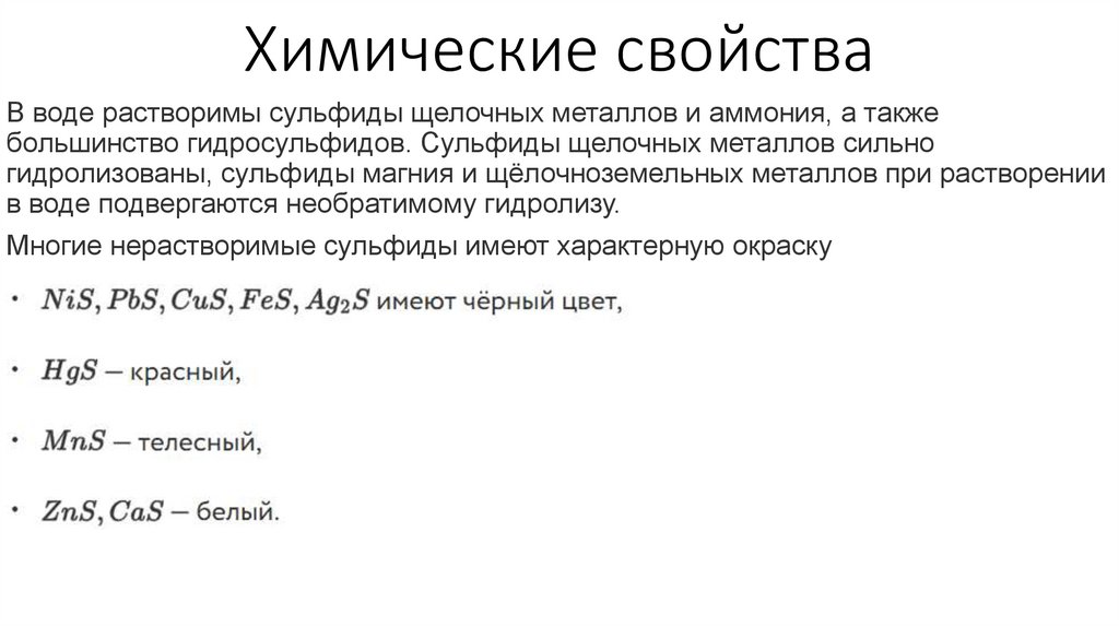 Химические свойстваВ воде растворимы сульфиды щелочных металлов и аммония, а также