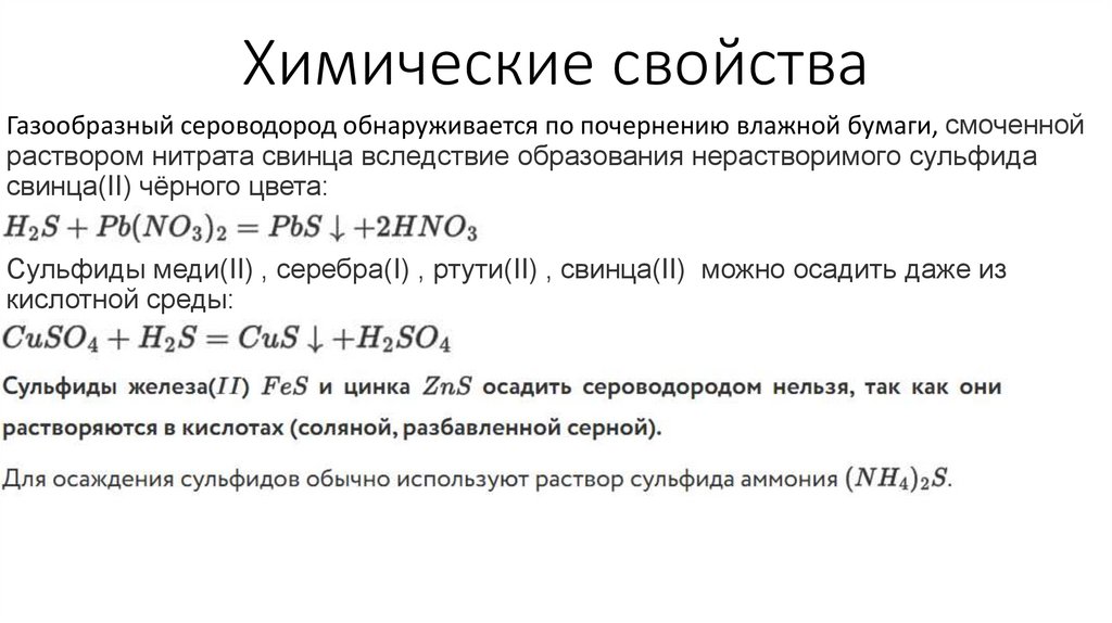 Химические свойстваГазообразный сероводород обнаруживается по почернению влажной бумаги, смоченной