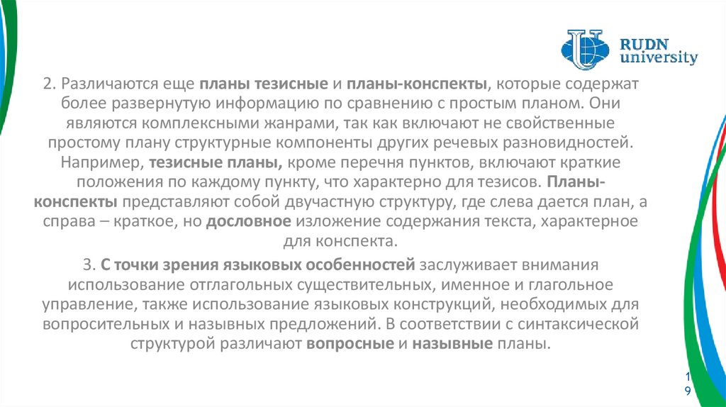 особенности плана.