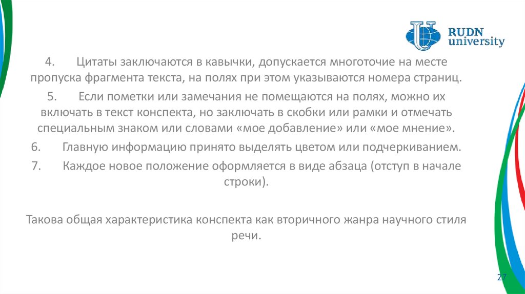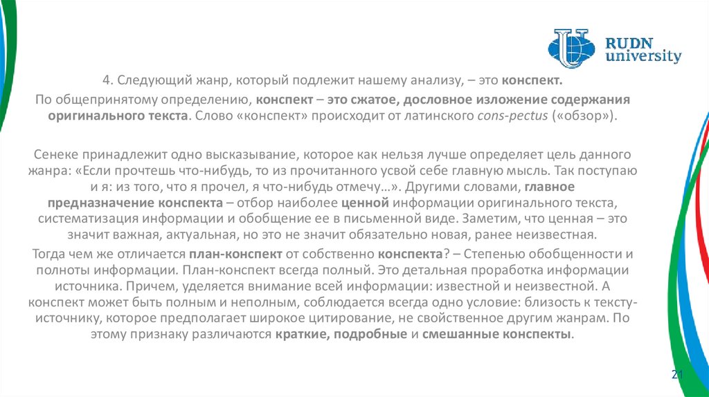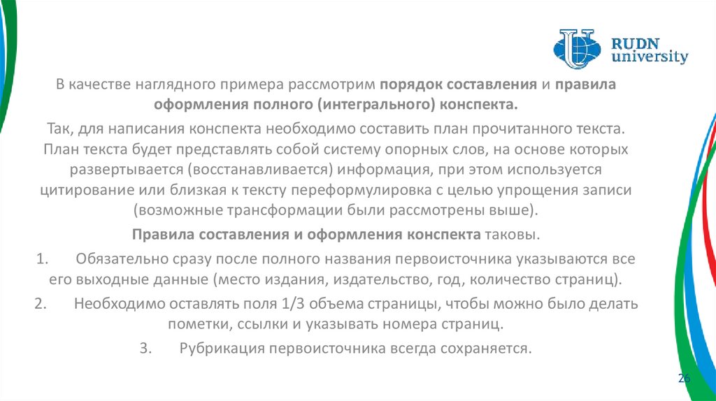 первоисточника; для конспекта – сжатое, но дословное изложение текстаоригинала; для реферата – обобщенная переработка первоисточника.