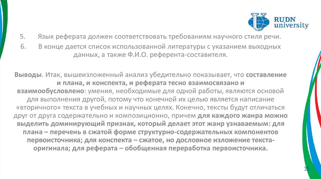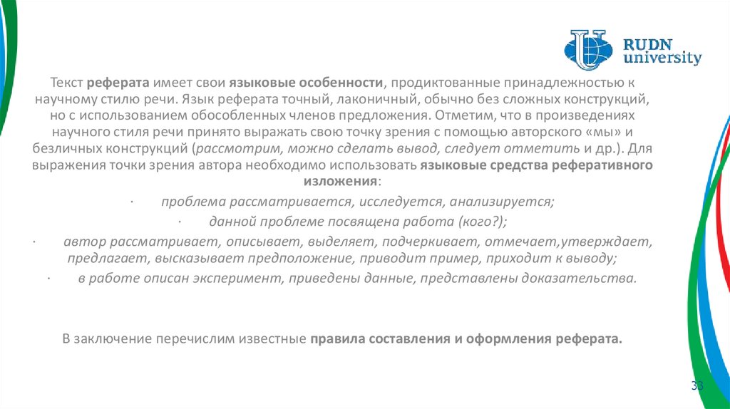 Язык реферата должен соответствовать требованиям научного стиля речи.
