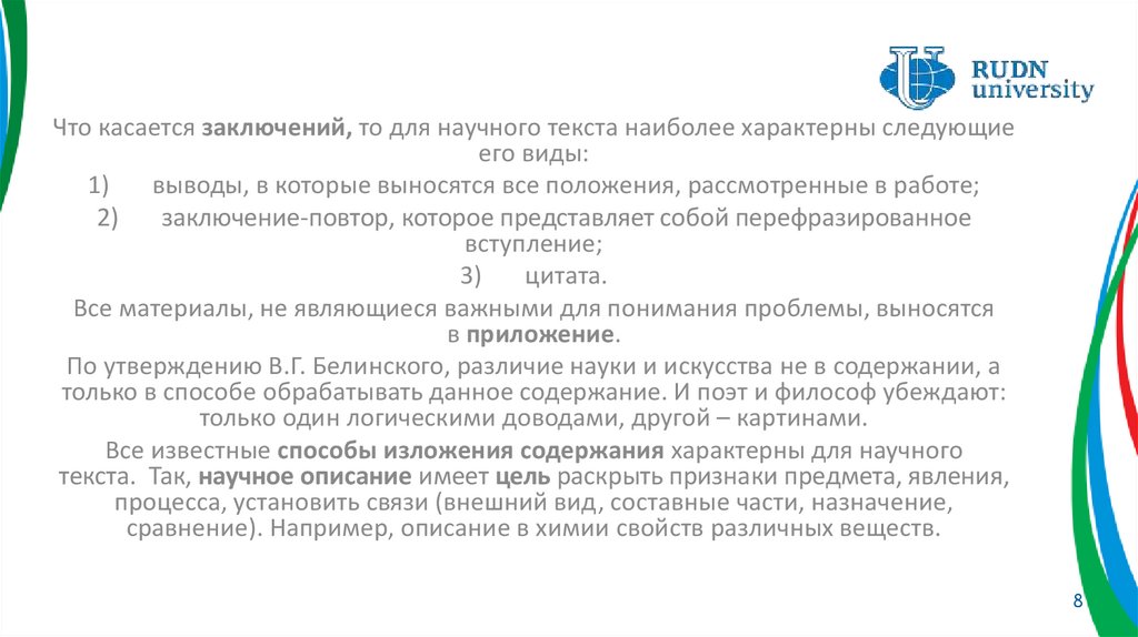 Что касается заключений, то для научного текста наиболее характерны следующиеего виды: